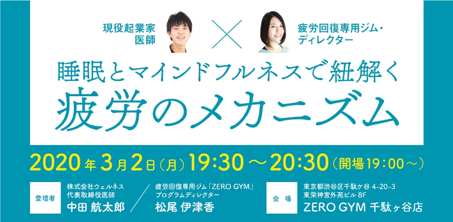 現役起業家医師と疲労回復ジム・ディレクターが 《疲労のメカニズム》を紐解く! 「睡眠とマインドフルネスで紐解く《疲労のメカニズム》」 3月2日(月)にセミナー開催!