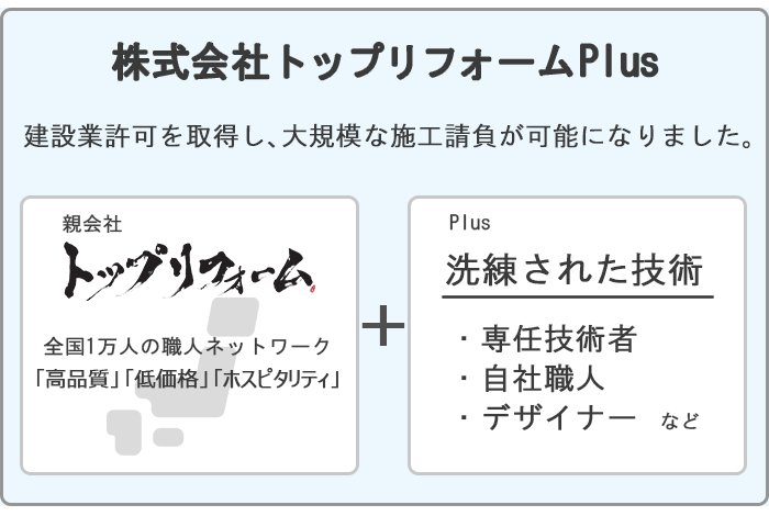 トップリフォームPlusは、親会社トップリフォームが保有する「高品質」「低価格」「ホスピタリティ」の職人ネットワークに、更なる価値をPlus。