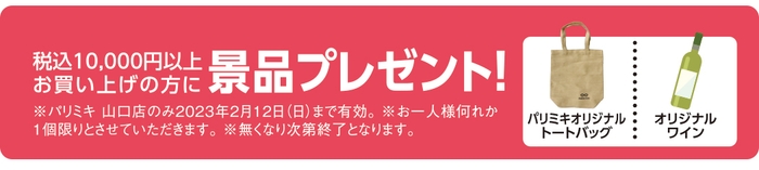 オープンを記念し、税込10,000円以上お買い上げの方に、パリミキオリジナル「トートバッグ」「ワイン」の何れか1つをプレゼント!
