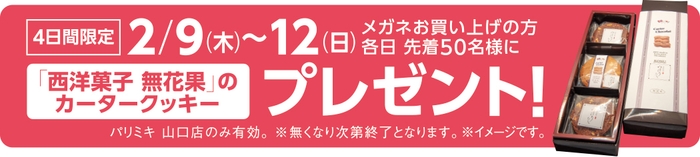 オープンを記念し2/9(木)~12(日)の4日間、メガネをお買い上げの方 各日先着50名様に、「西洋菓子 無花果」のカータークッキーをプレゼント!
