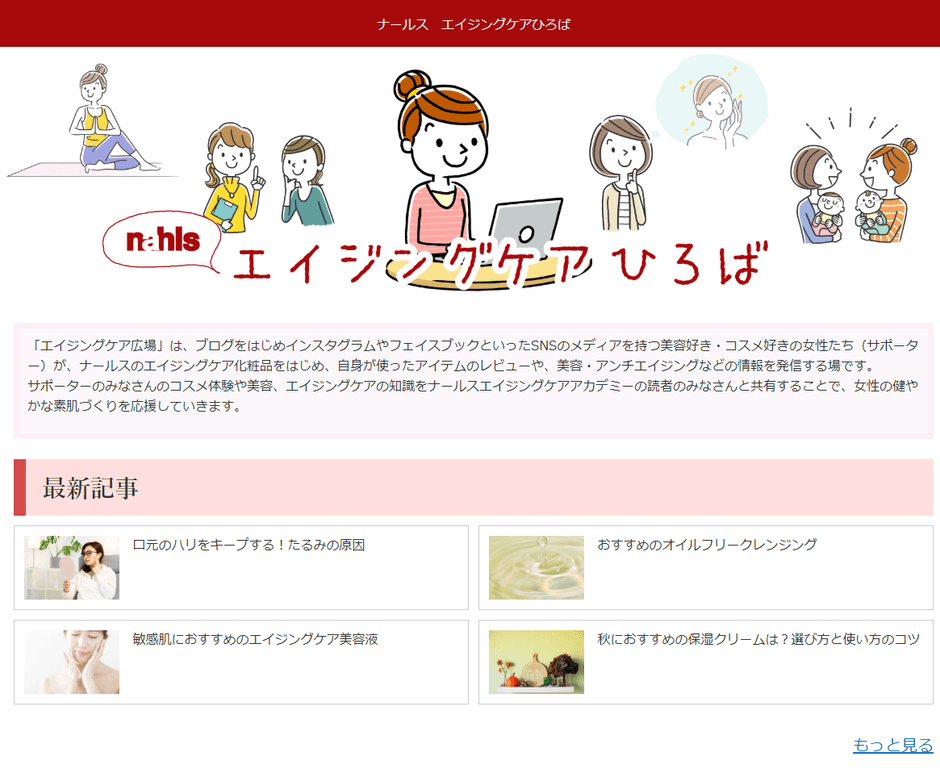 「ナールスエイジングケアひろば」では、当社からの情報発信に加えて、ユーザーであるサポーターのコスメ体験や美容、エイジングケアの知識を「ナールスエイジングケアアカデミー」の読者のみなさんと共有することで、女性の健やかな素肌づくりを応援していきます。