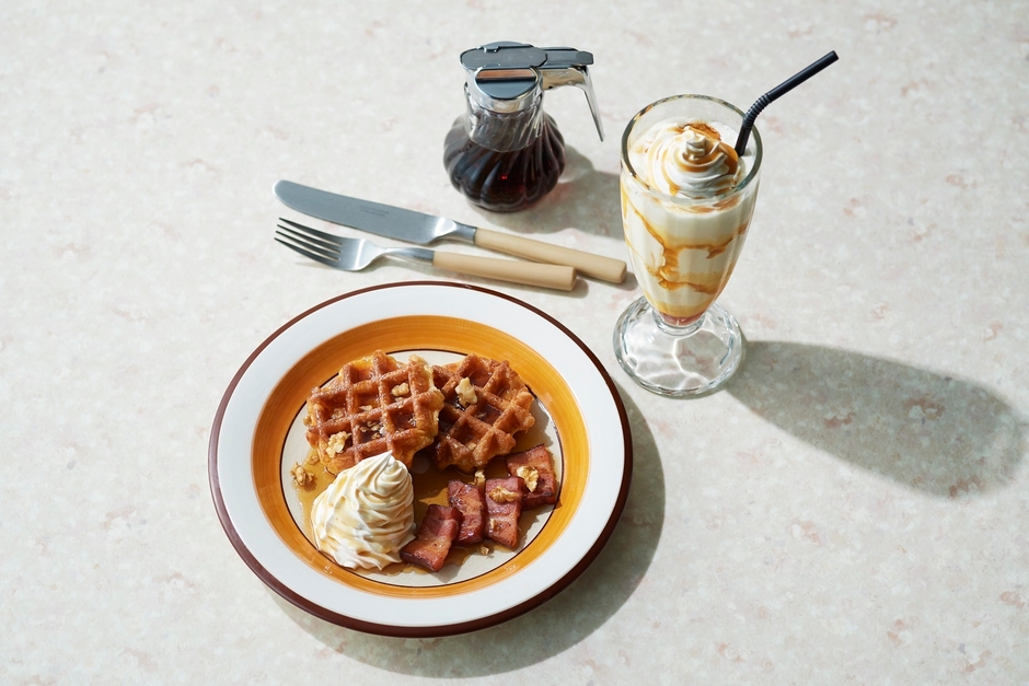 店内で焼き上げたメープルワッフルとメープルたっぷりのシェイク! 店内はいつもメープルの香り、メープル坊や行きつけのダイナーが誕生!