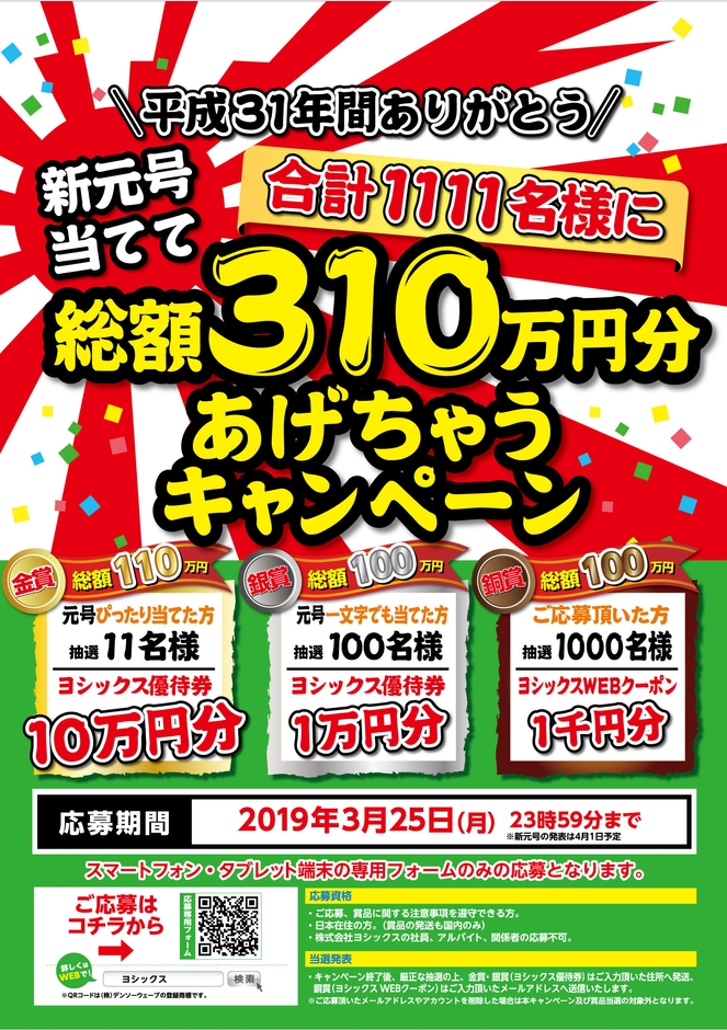 平成31年間ありがとう! 新元号当てて総額310万円キャンペーン開催!