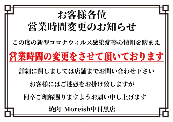 新型コロナウイルス感染拡大防止のための 営業時間に関するお知らせ