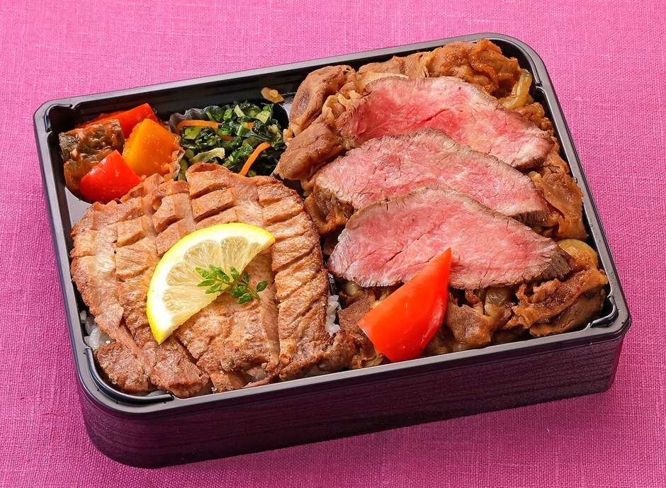 仙台牛のももと焼肉に、宮城名物の牛タンをのせた贅沢な食べ比べ弁当。