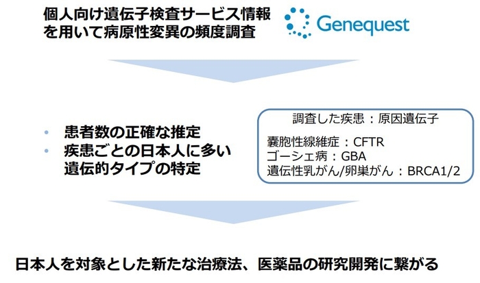 ジーンクエストが持つ個人向け遺伝子解析サービスを通じて遺伝子情報を解析した方の内、研究参加に同意いただいた方のデータを用いて、従来日本人集団では極めて低い頻度であるとされてきた希少難治性疾患/遺伝性関連遺伝子(CFTR, GBA, BRCA1, BRCA2)の頻度を分析しました。さらに、国内外の既報データと比較を行うことで、その妥当性・有効性を検証しました。