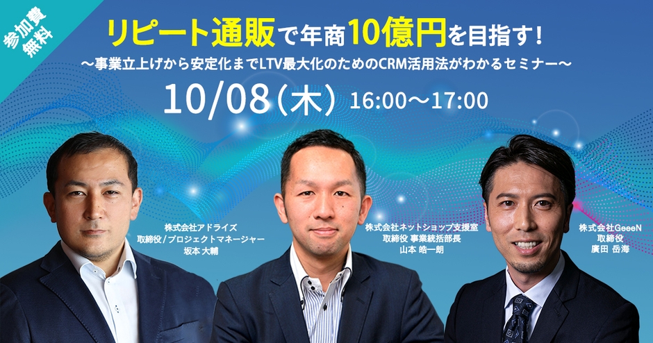 株式会社アドライズ(本社:福岡市中央区、代表取締役:大里 雅志)は、株式会社ネットショップ支援室、株式会社GeeeNと共催で、通販事業者様向け『リピート通販で年商10億円を目指す! ~事業立上げから安定化まで LTV最大化のためのCRM活用法がわかるセミナー~』を、2020年10月8日(木)に開催いたします。