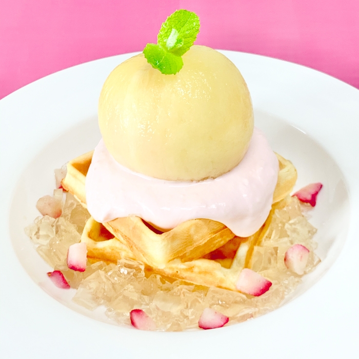 「まるごと白桃ワッフル」は、ピンクのクリームチーズを使ったソースはほんのりといちごの甘さが感じられる優しい味わいで、サクサクなワッフルと相性抜群です。