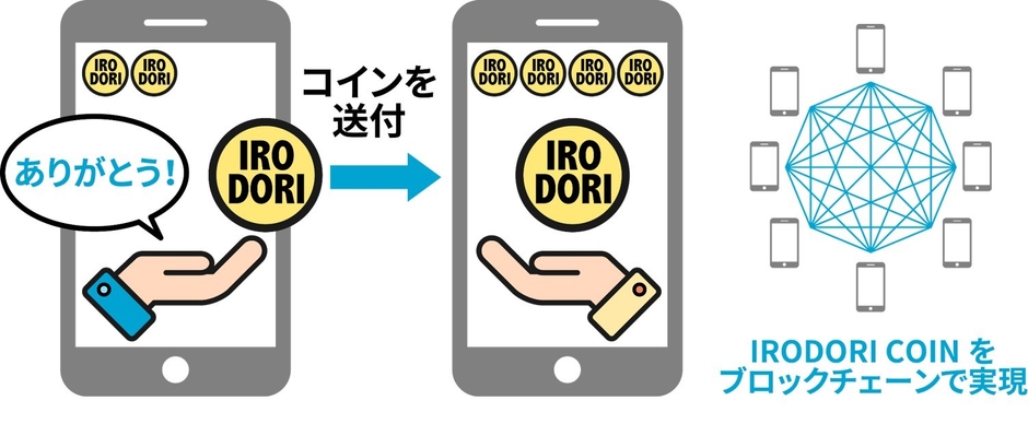 今回は、「arara coin(仮称)」を大阪商工会議所向けに「irodori coin」(彩コイン)としてカスタマイズし、実証実験をおこないます。具体的には、大阪商工会議所職員有志約30名に2ヵ月間、職場でのやり取りで生じた良い行いに対し、「感謝の気持ち」を「irodori coin」に変えて送り合ってもらい、そのトランザクション(送金頻度や送金相手の多様性)を検証します。また、結果を本サービスに対するエンゲージメント向上の検討に役立てます。