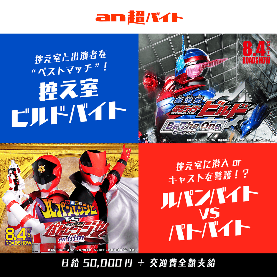 8月4日(土)公開の『劇場版 仮面ライダービルド Be The One(ビー・ザ・ワン)』『快盗戦隊ルパンレンジャーVS警察戦隊パトレンジャー en film(アンフィルム)』が「an超バイト」とスペシャルコラボ!舞台挨拶イベントの裏側で特別な体験ができるバイトを2企画同時募集します!