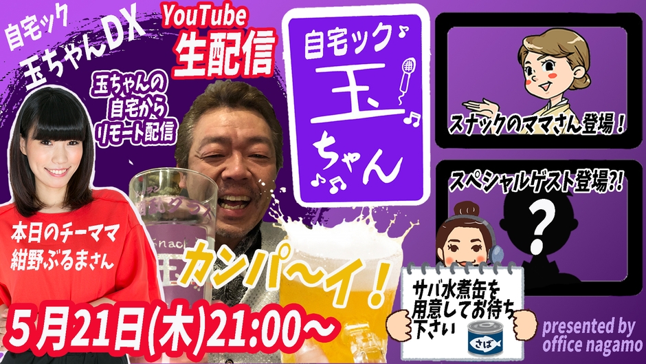 突然有名人から電話がかかってきたり、カラオケを始めたりと、何が起こるかわかならない生配信が、「玉さんと飲んでる気分になれる!」「自宅ック最高!」「究極のソーシャルディスタンス!」と大好評!