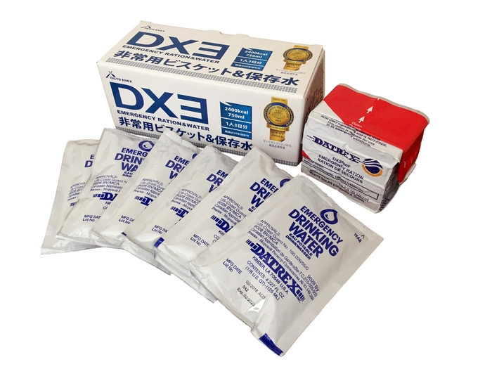 DX3は、5年保存可能な超コンパクトキットで、1人3日間の食糧と飲料水が備蓄でき、調理不要でそのまますぐ食べることができます。