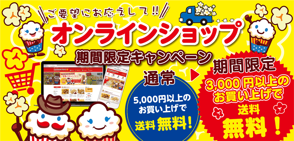 ポップコーンパパ オンラインショップご利用の際、通常であれば、5,000円(税込)以上のお買上げで送料無料のところ、期間限定で、3,000円(税込)以上のお買上げで送料無料にさせていただきます。