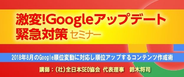 一般社団法人全日本SEO協会(本部:東京都港区、代表理事:鈴木 将司)は、検索で“上位表示する方法”を分かりやすく解説する『激変!Googleアップデート緊急対策』セミナーを、2018年10月24日(水)に東京国際フォーラム、10月5日(金)に大阪梅田、11月2日(金)に愛知県産業労働センター ウインクあいち、11月16日(金)に福岡県中小企業振興センターで開催いたします。