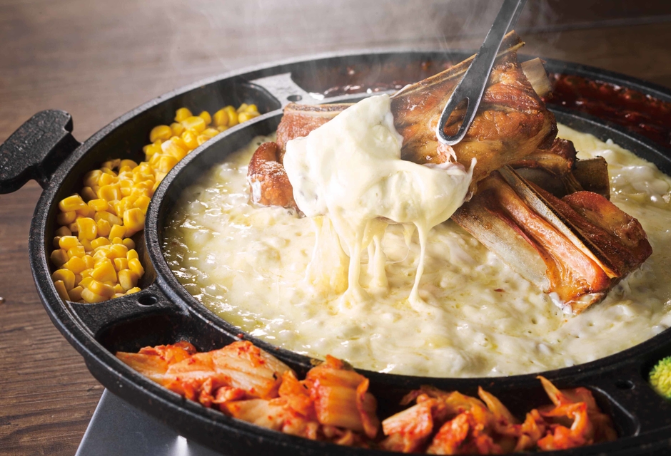 とろ~り!あつあつチーズに豪快にスペアリブをからめて食べる珍しいチーズ鍋。イチオシ〆は残ったチーズや具材とご飯を混ぜて焼きビビンバに!最後までチーズを楽しむことができチーズ好きにはたまりません!
