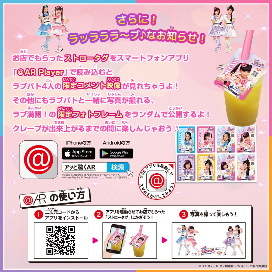 プレゼントされたストロータグを「スマートフォン用ARアプリ“@AR player”」で読み取ると…! なんと、ラブパト4人のキャンペーン限定コメントや、限定のフォトフレーム等、キャンペーン限定スペシャルコンテンツをお楽しみ頂けます。