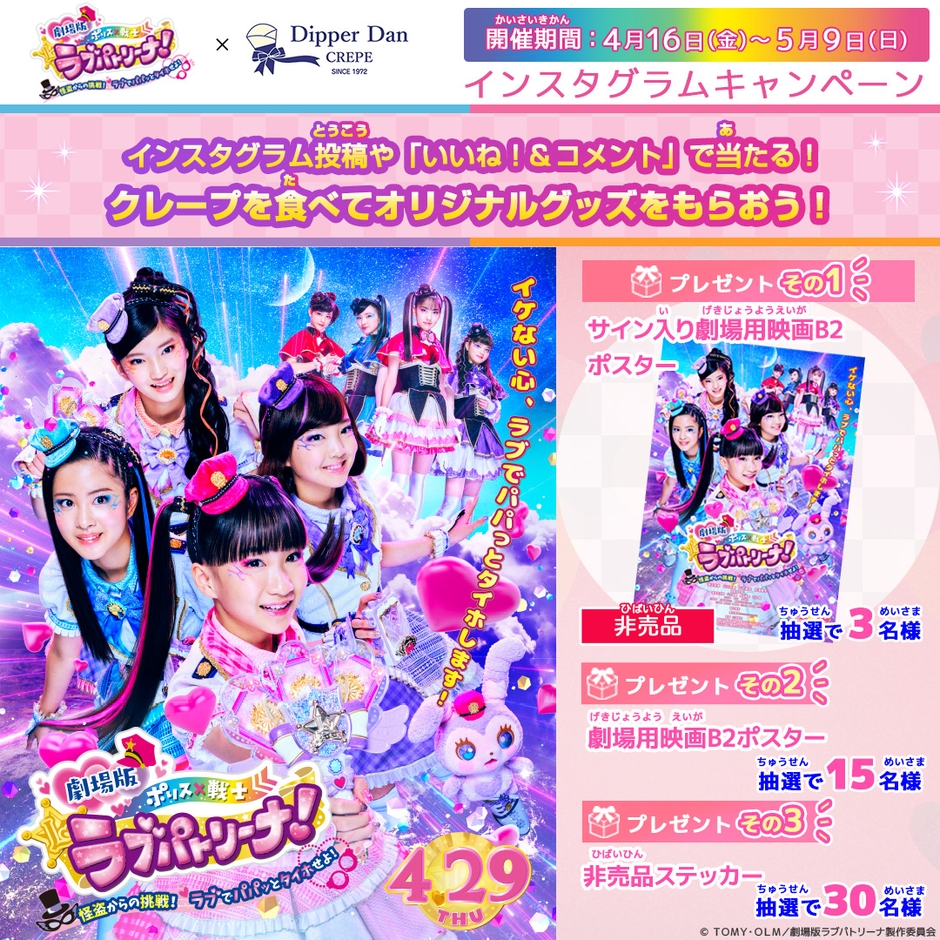 期間中、ディッパーダンへご来店、ご購入の商品を撮影いただき、公式フォロー、キャンペーンタグを付けて投稿してくださった方の中から、抽選で4月29日(木・祝)公開の『劇場版ラブパトリーナ!』サイン入りポスターほか、劇場ポスターや、非売品ステッカーなどをプレゼントいたします!