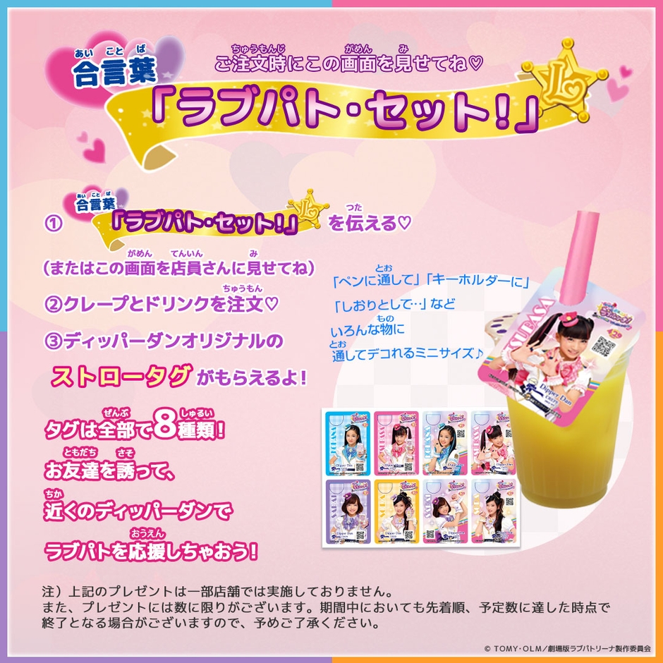 キャンペーン実施店舗において「クレープ」と一緒に「ドリンク」をご注文の際に、合言葉「ラブパト・セット!」を伝えると、「ラブパトリーナ!ストロータグ(ディッパーダンオリジナルデザイン)」をプレゼントいたします。