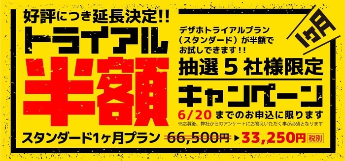 「デザホ」をお手軽に体験してみたいというクライアント様のご要望により、リリースから半年が経ちました【デザホ1ヶ月トライアルプラン】。おかげさまで、さまざまなクライアント様からご依頼を頂戴していますが、より沢山の企業様にデザホをご使用いただきたく、この度「トライアルプラン」を5社様限定にて、従来価格より半額の“¥33,250-(税別)”にてご利用いただけるキャンペーンを実施する運びとなりました。