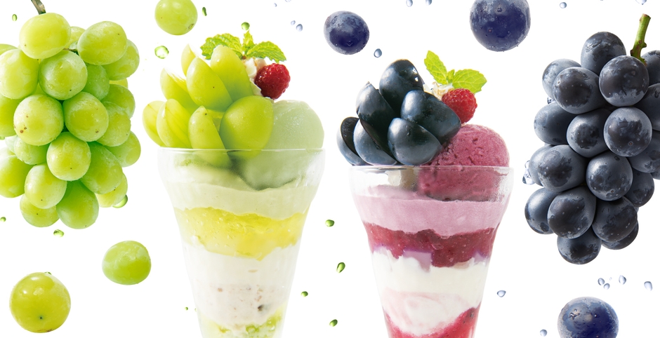 これら2種類の果実を、ぶどうゼリーやぶどうクリーム、ぶどうソルベなどとともに人気のザ・サンデーやミニパルフェ、ゼリー仕立てにしました。