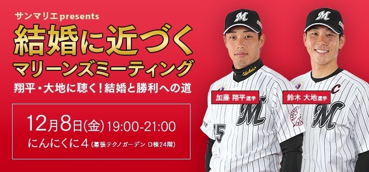 結婚相談所サンマリエ(運営:ハピライズ株式会社、本社:東京都新宿区、代表取締役:林 順之亮)と、株式会社千葉ロッテマリーンズ(本社:千葉県千葉市美浜区、取締役社長:山室 晋也)は、第3回目となる人気選手のトークイベント「結婚に近づく マリーンズミーティング ~翔平・大地に聴く!結婚と勝利への道~」を2017年12月8日(金)に幕張テクノガーデン内「にんにくに4」で開催いたします。