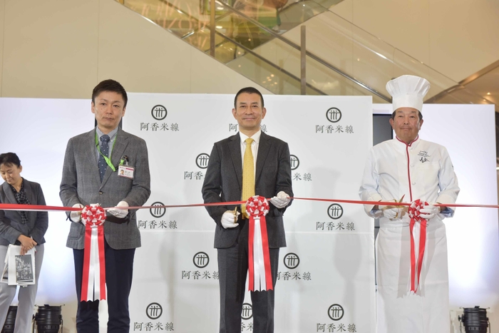 また、ゲストに阿香米線と交流のある「料理の鉄人」で有名な赤坂四川飯店オーナーシェフの陳建一さん、施設側の代表としてイオンレイクタウンmori ゼネラルマネージャー 重松雅人さんをお迎えし、何 勇とともにオープン記念のテープカットを行いました。その後、陳建一さん、何 勇によるトークセッションを行い、共通の「豆板醤」を使用している事が話題になり、陳建一さんからは阿香米線で食事をした時の印象や、阿香米線への激励などお話し頂きました。