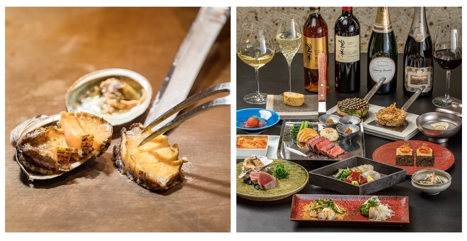 写真左:鉄板料理イメージ(アワビ)、写真右:料理集合イメージ