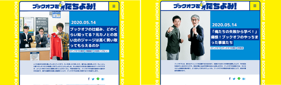 「ブックオフをたちよみ!」は、ブックオフのことをもっと知っていただこうという想いから誕生したメディアです。ブックオフの常連様はもちろん、たまに気が向いたら来店されるお客様、そしてまだ来られたことのない未来のお客様、さらには以前ブックオフで働いていた方など、どなたでも楽しんでいただけるようなコンテンツを用意しています。ブックオフの店舗に立ち寄るのと同じような気軽さでサイトを楽しんでいただけます。