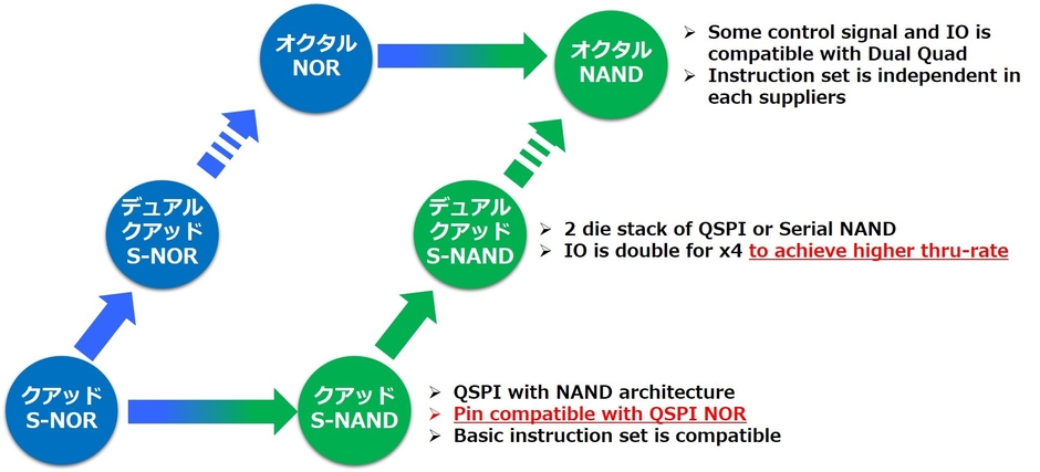 ウィンボンドのOctalNAND/W35N-JWファミリは、オクタル NORフラッシュメモリと互換性を持つため、容易に置き換え可能です。さらに、シリアルNORフラッシュメモリとのフットプリント互換、また現在市場に出回っているXccela(TM)フラッシュメモリおよびオクタルNORフラッシュメモリと完全なピン互換性があります。車載業界の主要顧客は、新しい設計において、オクタル NORフラッシュメモリをウィンボンドのOctalNAND/W35N-JWファミリに置き換えることでブート時間の短縮とBOMコストの低減を実現可能です。