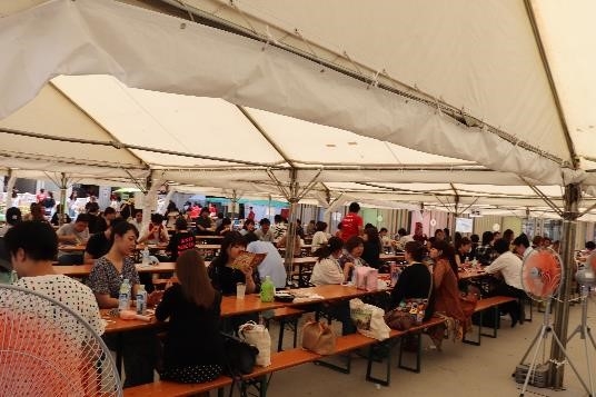 日本最大の激辛グルメの祭典「激辛グルメ祭り2019」開催初日。夏の日差しが降り注ぐ炎天下、会場では辛さと旨さを待ち望んだお客様ばかり。オープン前には行列ができ、会場内でも行列店も登場するほどの賑わい。香辛料の香りが漂う会場は30度を超えていますが、日除けのテントがあるために快適に過ごせます。辛さと格闘しているお客様は、すぐさま「辛ぁ〜い」という悲鳴。止まらぬ汗にタオルが外せない様子でした。止まらない箸を見れば、辛さだけではなく確かな味であることがわかります。
