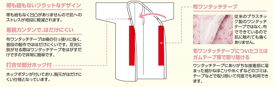 在宅介護の増加や超高齢社会による介護需要の急増に対し「更衣介助の時短化・簡易化・着用者の着心地向上」を目的として開発された本商品は、ねまきの内・外紐を取り去り、当社初となる布製ワンタッチテープを用いての着脱を実現しました。