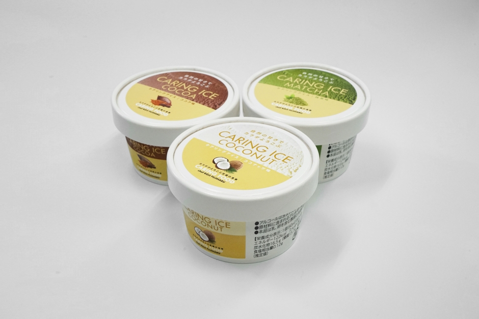 ケアリングアイスは、白砂糖、小麦粉、卵、動物性乳製品を使わず、甘酒とココナッツミルクと豆乳を主原料とし、さらにおからパウダーが入っているため、不足しがちな食物繊維も摂れる健康的なアイスとなっています。フレーバーは、ココナッツ味、抹茶味、ココア味の3種類あります。