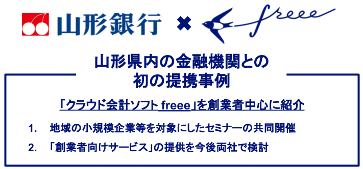 freee株式会社(本社:東京都品川区、代表取締役:佐々木大輔、以下 freee)は、株式会社 山形銀行(本社:山形県山形市、取締役頭取:長谷川吉茂、以下 山形銀行)との業務提携を本年7月3日より開始することをお知らせします。freee にとって、山形県内の金融機関との初の提携事例になります。今回の提携を通じて、地域の創業者を中心に「クラウド会計ソフト freee」などfreee が提供するサービスの導入を共同で推進してまいります。創業当初から経理業務の効率化や生産性の向上に取り組むことで、地域経済の活性化を目指してまいります。