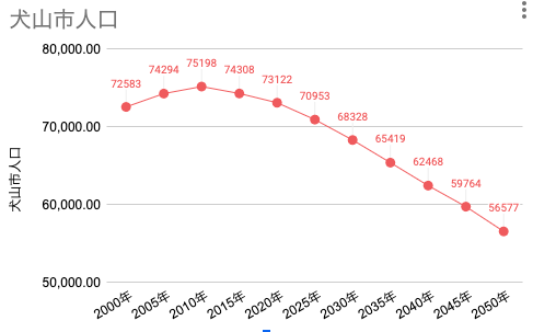全国の天守閣が現存する12城の中で、日本最古といわれる天守閣が残る犬山城の城下町・愛知県犬山市の人口数は、2010年75,198人をピークに4人に1人のペースで減少が進んでおり歯止めがかかりません。2050年には56,577人と予想されています。
