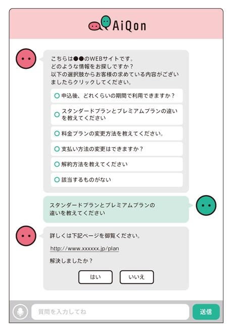 AiQonは、WEBサイト訪問者が求める情報を的確かつ柔軟に提供する、進化型のAIチャットボットアプリです。サイト訪問者が情報を「探す」というプロセスから、サイト訪問者が求める情報を「提供する」ことへと変化させることで、情報獲得体験をサポートします。