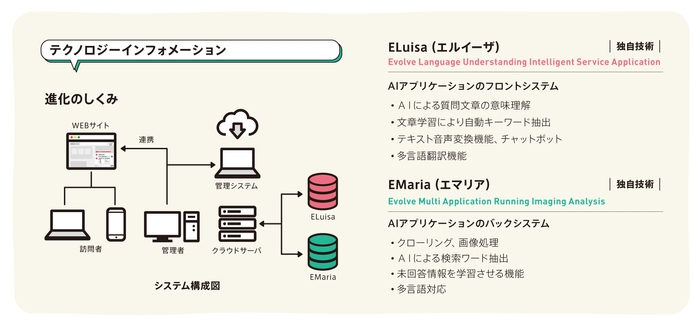 AiQonのアプリケーションは、フロントシステム「Eluisa(エルイーザ)」とバックシステム「EMaria(エマリア)」の2つの独自技術によって、言語や文章の解析機能が飛躍的に進化。多言語の質問内容を正しく理解するだけでなく、ディープラーニング機能による柔軟かつ適切な回答を実現。バックシステムの「ELuisa」は独自のサイトクローリング機能と画像認識機能により、サイト内の添付ファイルや画像からもキーワードを抽出し、回答を行うことが可能です。
