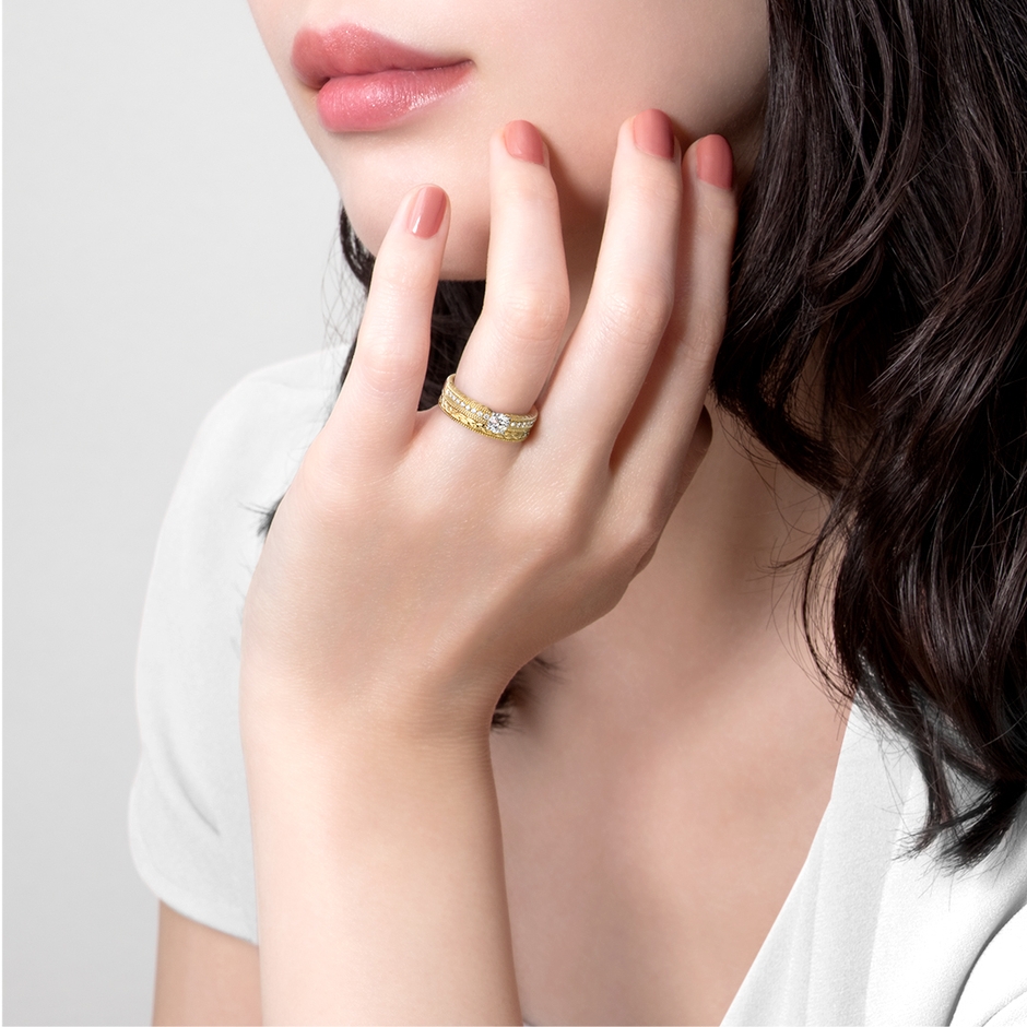 時代を超えて永く愛される月桂樹のモチーフを側面に施した、クラシカルなデザイン。華やかなゴールド×落ち着きのあるプラチナのコンビネーションが、ノーブルな印象を醸し出しています。センターダイヤモンドの脇には、計20ピースものメレダイヤモンドがきらめいて。輝きに満ちたリングはまるでふたりの未来を明るく照らし、祝福しているよう―。