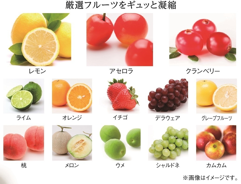 ※3 レモン果実エキス、ライム果汁、オレンジ果汁、アセロラ果実エキス、イチゴ種子エキス、乳酸桿菌/ブドウ果汁発酵液、グレープフルーツ果実エキス、モモ果実水、メロン胎座エキス、ミルシアリアデュビア果実エキス、クランベリー果実エキス、加水分解アメリカブドウ果皮エキス、ウメ果実エキス