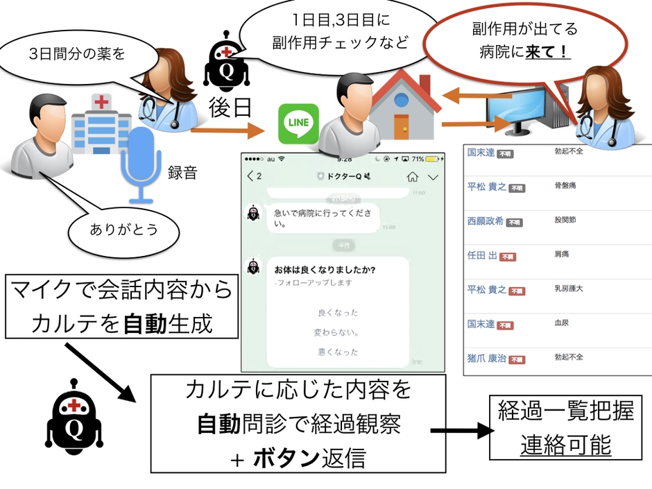 本システムでは利用者となる患者と医師それぞれのための機能を用意しています。医師と患者が本システムを介してコミュニケーションをすることで、お互いにとってより良い医療環境を構築することが可能となります。患者はLINEで「ドクターQ」のLINEボットを友だち追加することで、全てスマートフォンのLINEアプリ上で操作を行えます。医師が本システムを利用していれば、医師代わりのチャットボットからの問診を受けたり、自分自身のカルテを閲覧したりすることができます。医師は、「ドクターQ」のサービスウェブサイトにアクセスすることで、患者の経過を把握し、ボットを通して患者と接触することができます。電子カルテのフォーマットに沿う形式でチャットボットが医師の代わりにLINEのチャット画面を通して患者に経過を質問します。