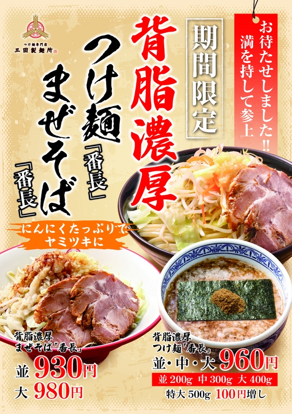 株式会社エムピーキッチン(所在地:東京都渋谷区、代表取締役:佐藤 崇史)が運営する、つけ麺専門店「三田製麺所」が、2017年10月1日(日)から2017年11月末までの約2か月間、秋季限定で“背脂濃厚 つけ麺「番長」”“背脂濃厚 まぜそば「番長」”を販売いたします。
