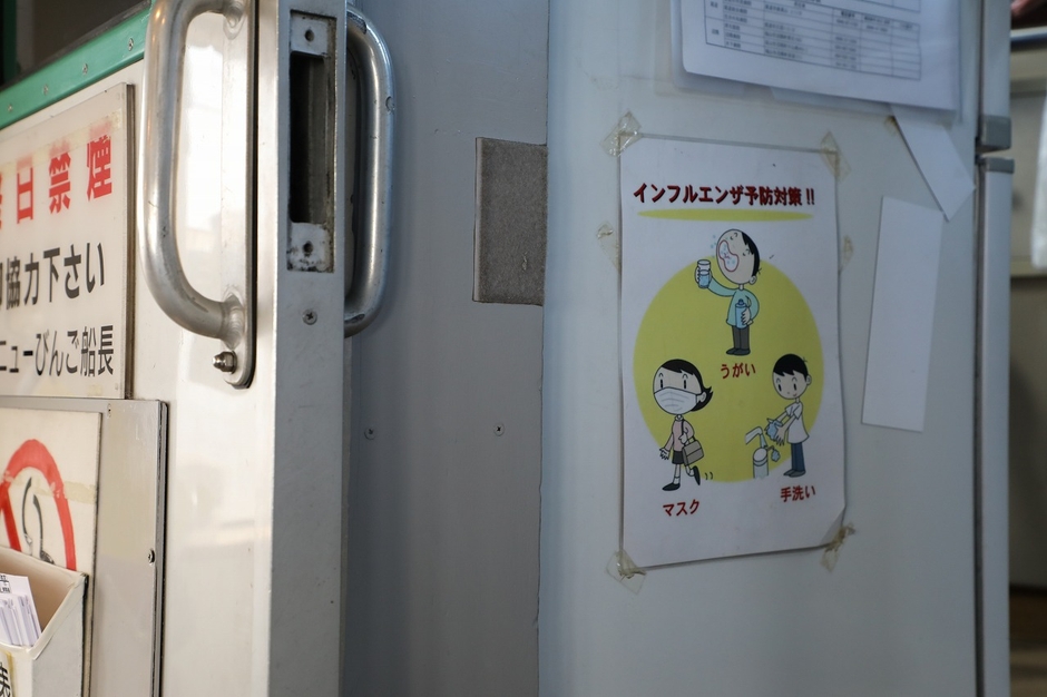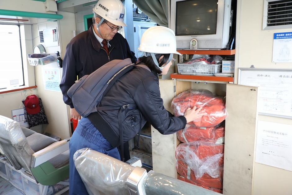 点検では、救命胴衣などの設置状況や消火器などの安全設備をはじめ、船員の健康状態や飲酒対策などについて確認しました。また、船舶検査証などの書類のチェックのほか、自然災害や事故、テロ、新型インフルエンザ等が発生した場合の乗客の安全確保対策や関係機関への通報・連絡・指示体制の確認も行われました。