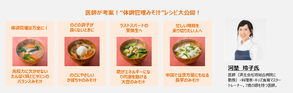 今回は、体調管理にピッタリのみそ汁に加え、受験生にうれしいみそ汁や年末年始に忙しかった方が一息つけるみそ汁のレシピを医師・河埜玲子氏に考案していただきました。