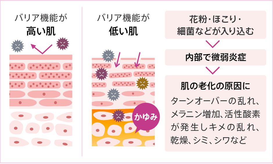 肌の乾燥対策として効果的なのが「セラミド」です。セラミドは、肌のバリア機能を高め、外からの刺激物を跳ね返し、また肌の内側で潤いを保ってくれます。バリア機能が高い肌は、セラミドが、外からの刺激物が入り込む隙間がないほど肌の内側を隙間なく埋めている状態です。逆に、セラミドが減少すると隙間ができてしまい、バリア機能が低下してしまいます。バリア機能が低下すると、肌の水分を逃がしたり、刺激物が肌の中に入り込みやすくなってしまいます。セラミドは、体内で自然と作られる成分ですが、加齢やストレスによって減少してしまうため、補う必要があります。
