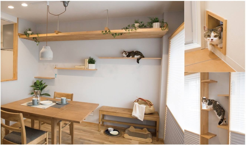 (1)オリジナル家具「マイリノ・キャットルーフ」と「マイリノ・キャットステップ」 部屋のインテリアにあったデザインで、猫の運動不足解消に配慮