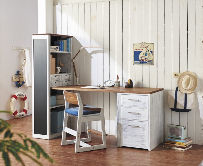 デスク・チェア・サイドチェスト・マルチラック・シェルフで構成される同シリーズは、天板にアカシアハギ材を採用。側板はパイン突板材仕様で、白を基調に一つ一つ手作業で古材感のある仕上げをしています。また、シェルフの片側面にはブラックボード(黒板)を備え、チェア座面にはデニム生地を採用しました。価格(税抜)は、デスク・マルチラック・サイドチェストが72,900円、シェルフ97,400円、チェア33,000円です。