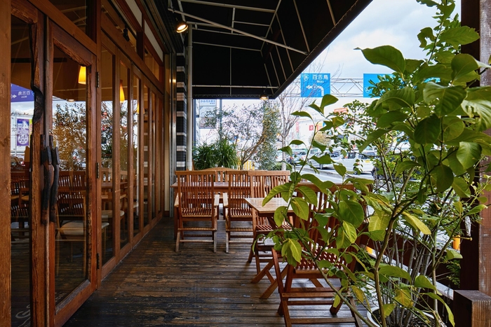店内は天井高5mの開放的な空間で、木材や土壁、自然塗料が多用されたナチュラルな雰囲気。外にはテラスがあり、季節のいい時は外でも楽しんでいただけます。