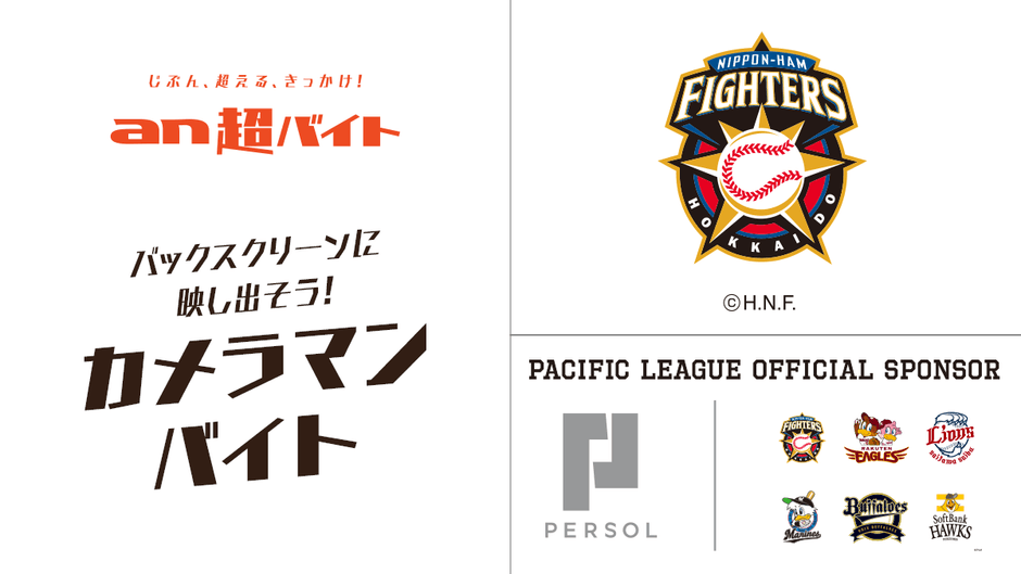アルバイト求人情報サービス「an」による思わず挑戦してみたくなるような「an超バイト」の新企画として、5月11日(土)14:00~札幌ドームにて行われる「北海道日本ハムファイターズvs埼玉西武ライオンズ」の試合で場内の観客をバックスクリーンに放映していただく、カメラマンバイトを1名募集します!報酬は、日給5万円を支給。さらにサイン入りユニフォームもプレゼントします。