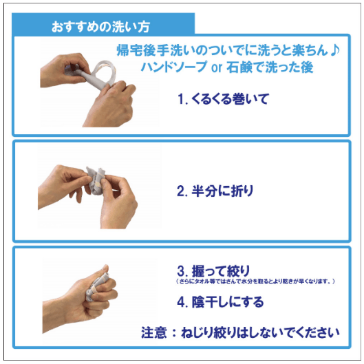 お洗濯の際は手洗いをお勧めします。帰宅後手を洗う際に、一度手を洗った後にハンドソープや石けんを使いついでに洗うと簡単です。手洗い後、くるくる丸めて半分に折り、握るようにして絞り、叩いて形を整えて、陰干ししてください。