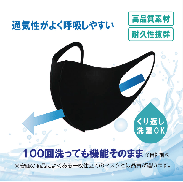 ウォッシャブルで繰り返し洗っても半永久的に機能が継続します。ファンデーションなど汚れが付きにくく、落ちやすいのでお手入れも簡単。不織布特有の不快感(かゆみ、毛羽立ち、鼻のもぞもぞ感、汗じみ、呼吸や会話のしにくさ等)もありません。