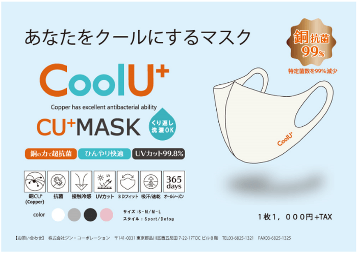 株式会社ジン・コーポレーションは、繰り返し洗っても半永久的に機能が続く冷感抗菌マスク『CoolU』(クールユー)を日本で販売開始します。
